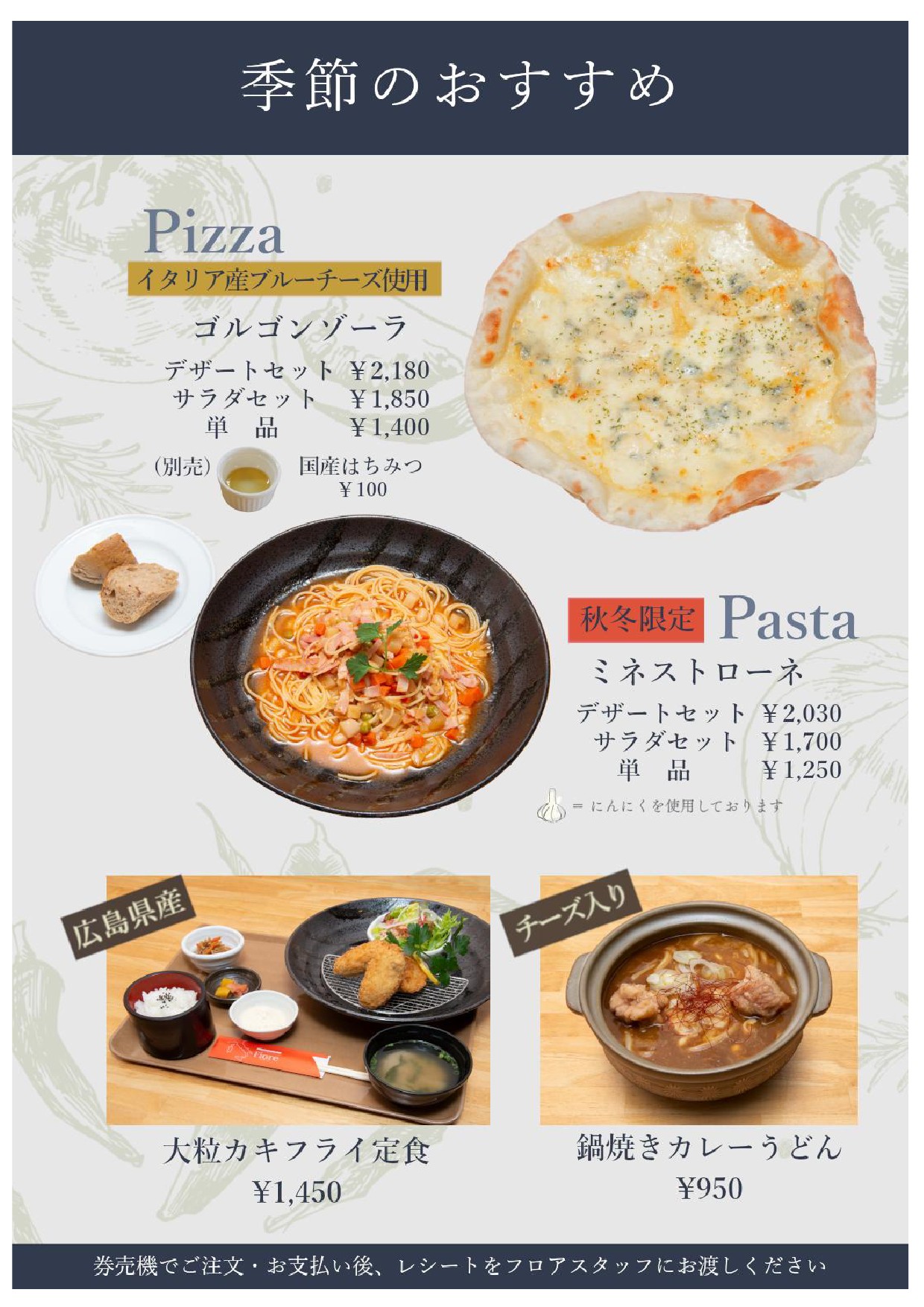 | Pasta ミネストローネ 秋冬限定 (にんにくを使用しております) | デザートセット 2.030円 サラダセット 1,700円 単品 1,250円 |